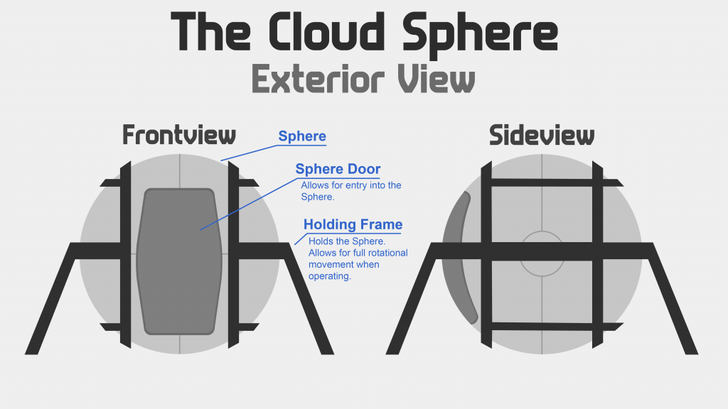 These images were created for a class project in which our team had to create a made-up video game device to better immerse the player in the game. My team came up with the idea of a VR sphere device which allowed a person to rotate around a small environment with miniature blowing fans to simulate floating in air. I drew up images of the devices proposed for this VR device.